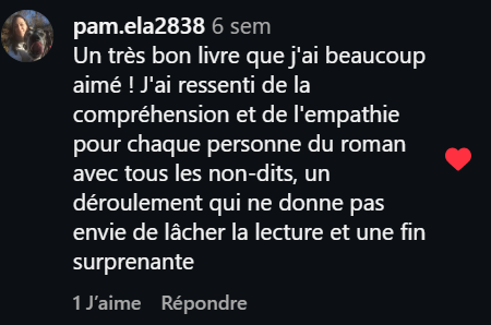 « Ce roman m’a transporté du début à la fin. Très bien écrit, avec une histoire plus qu’émouvante. Je conseille ce livre à 1000% !!! »