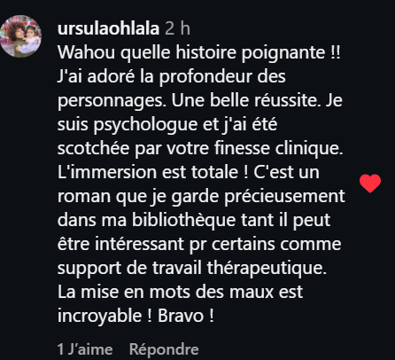 Le récit suit le parcours d’une femme blessée, marqué par un passé douloureux qu’elle ne peut ni effacer, ni ignorer. Bravo pour la justesse avec laquelle son cheminement est décrit. L’histoire nous tient en haleine par la profondeur émotionnelle et la vérité des personnages. C’est un roman puissant porté par une plume sensible, qui explore avec délicatesse la résilience et la capacité à vivre avec ses cicatrices. Une lecture intense, marquante, et profondément humaine qui m’a beaucoup émue. »